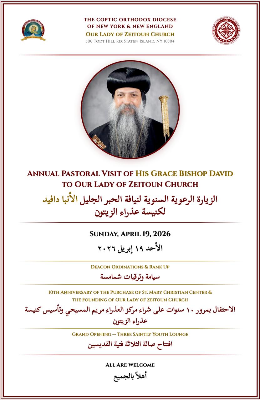With great joy and reverence, we welcome the Annual Pastoral Visit of His Grace Bishop David to Our Lady of Zeitoun Church this Sunday, April 19, 2026.